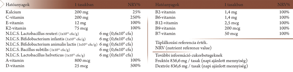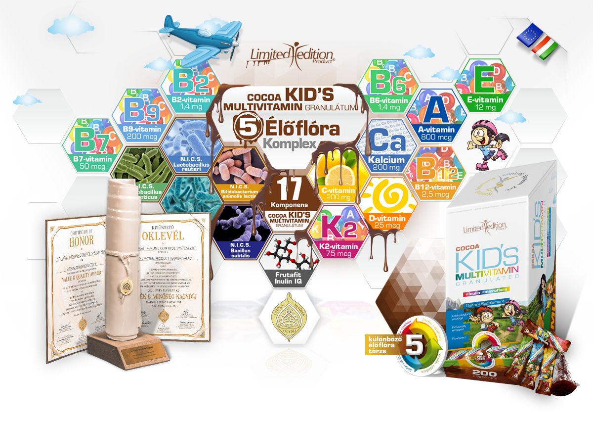 Innovatív bevezetésként egy limitált megjelenésű termékkel egészítjük ki granulátum családunkat. Egy vadonatúj, kakaós ízvilágot fejlesztettünk ki, hogy a vitaminfogyasztás még inkább élménnyé válhasson azok számára, akik a legfontosabbak számunkra: gyermekeinknek. A vitamin összetétel tekintetében a már bevált, éves gyermekvitamin összetételével megegyező készítményt alkottunk. De ezeket nem a korábbi, éves termékben használt élőflóra törzsekkel, hanem a társaságunk részére egyedien kiválogatott, NICS előtaggal megkülönböztetett élőflóra törzsekkel egészítettük ki, lehetővé téve ezáltal, hogy a két gyermekvitamint felváltva, vagy kombinálva használók már 11 különböző élőflóra törzzsel lássák el szervezetüket.