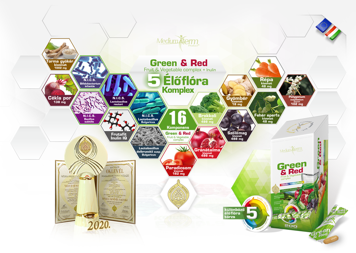 Ez a Medium-term Product termék ötféle élőflórát tartalmaz emelt csíraszámban, továbbá a hatékonyságot növelő Inulint.